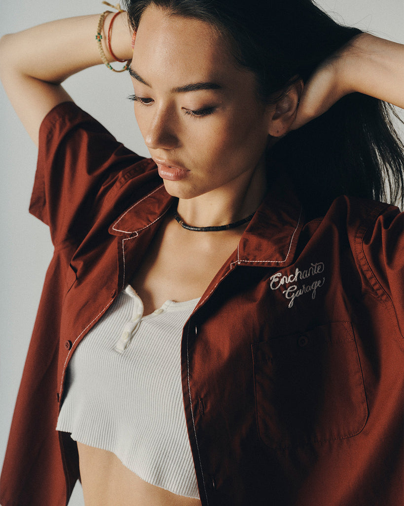 A cleaner take on the classic garage shirt. Made from crisp cotton poplin with contrast stitching and a chainstitched logo at the chest, this short-sleeve button-up is structured, sharp, and ready for work or weekend.
