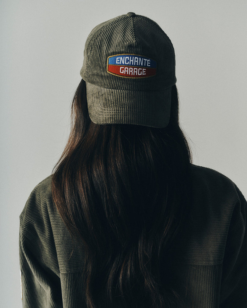 Corduroy texture with mechanic energy. Finished with an Enchanté Garage patch and structured crown, this hat adds just the right amount of vintage uniform feel to any outfit.