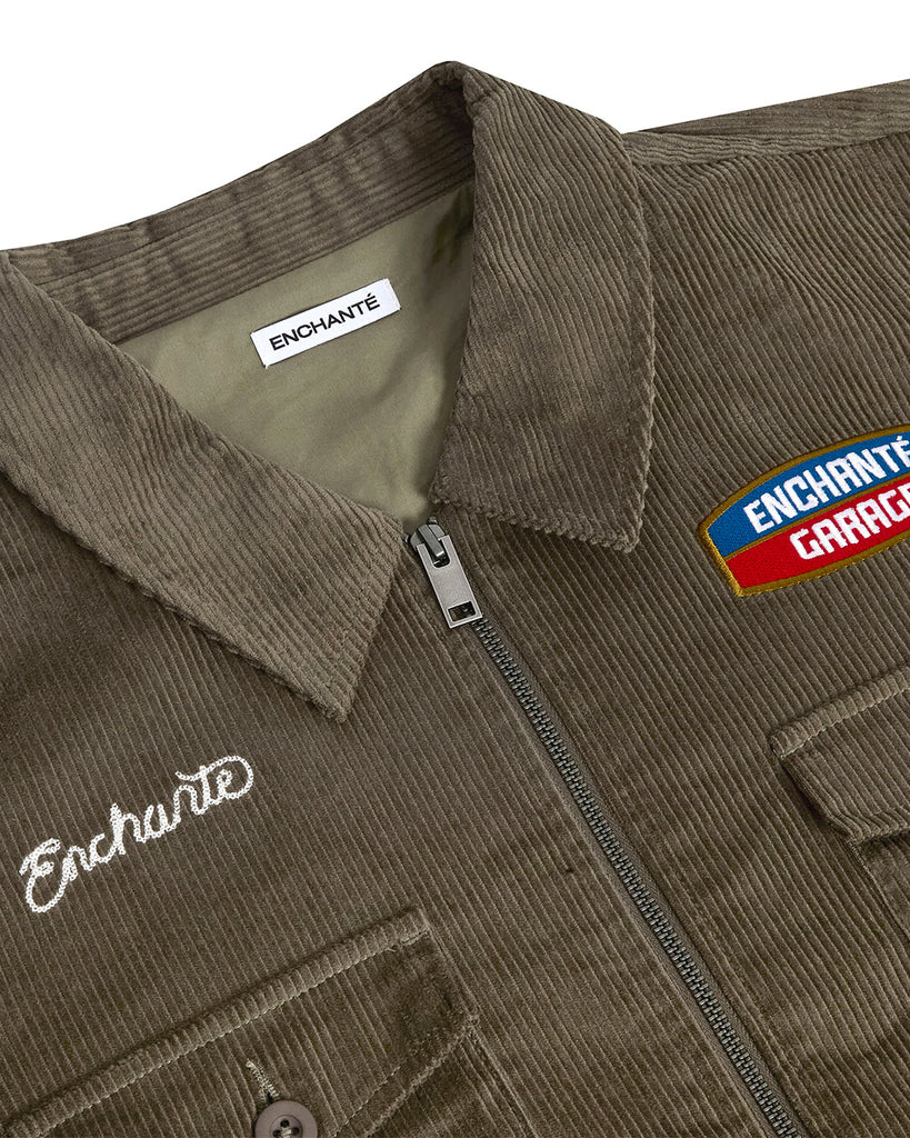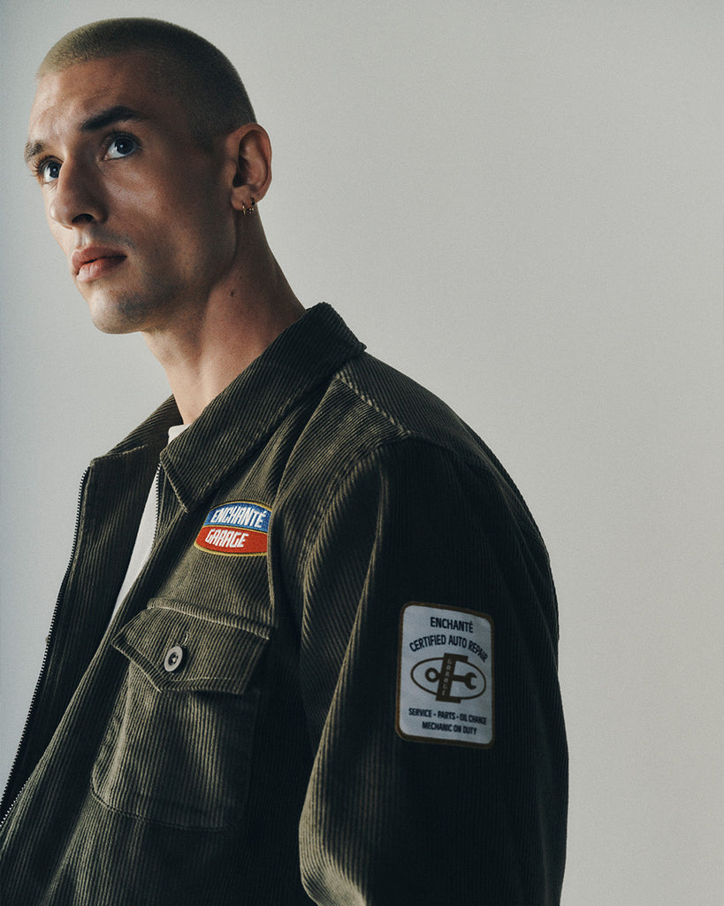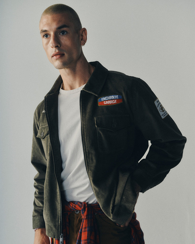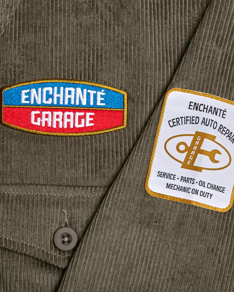 The mechanic’s jacket, reimagined. This piece features crisp corduroy, dual chest pockets, and retro-inspired Enchanté Garage patches. The 2-way zipper gives you options, whether you’re layering over a hoodie or tee.