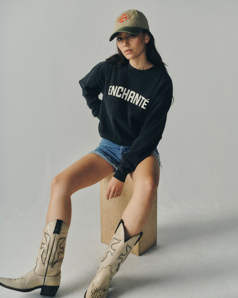 Utility on the outside, comfort underneath. This heavyweight crewneck features a bold, arched Enchanté print across the chest, inspired by vintage workwear and old-school auto uniforms. Garment-dyed for a lived-in finish, it’s a staple built to last.