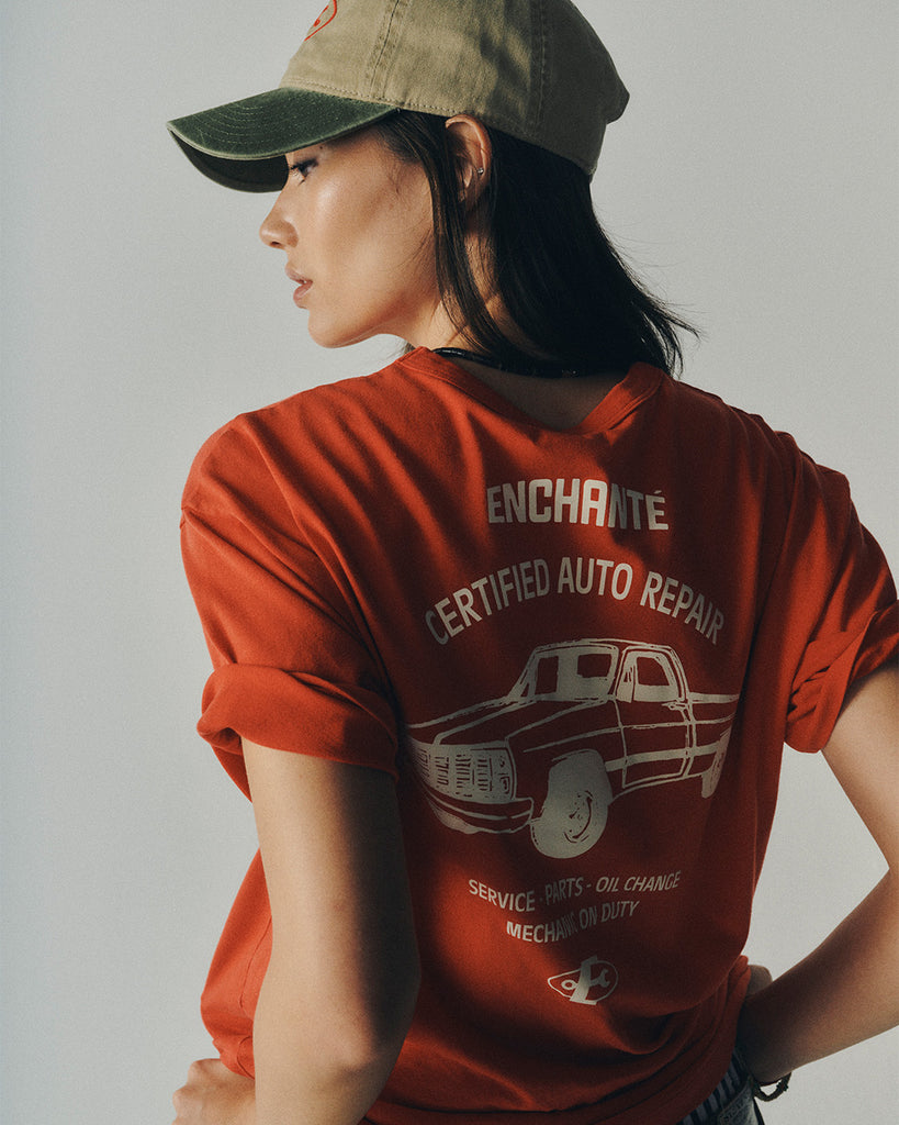 Certified Auto Repair, Enchanté style. The Certified Repair Tee features our custom E Wrench logo at the chest and a full back graphic inspired by classic service shops. Printed on garment-dyed cotton that’s soft, sturdy, and built to wear in well.