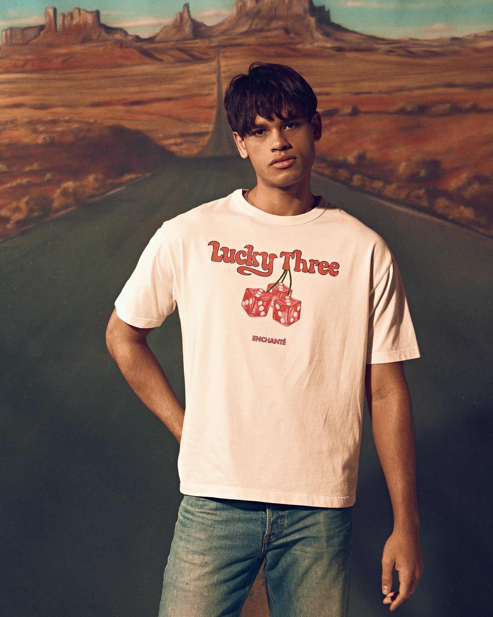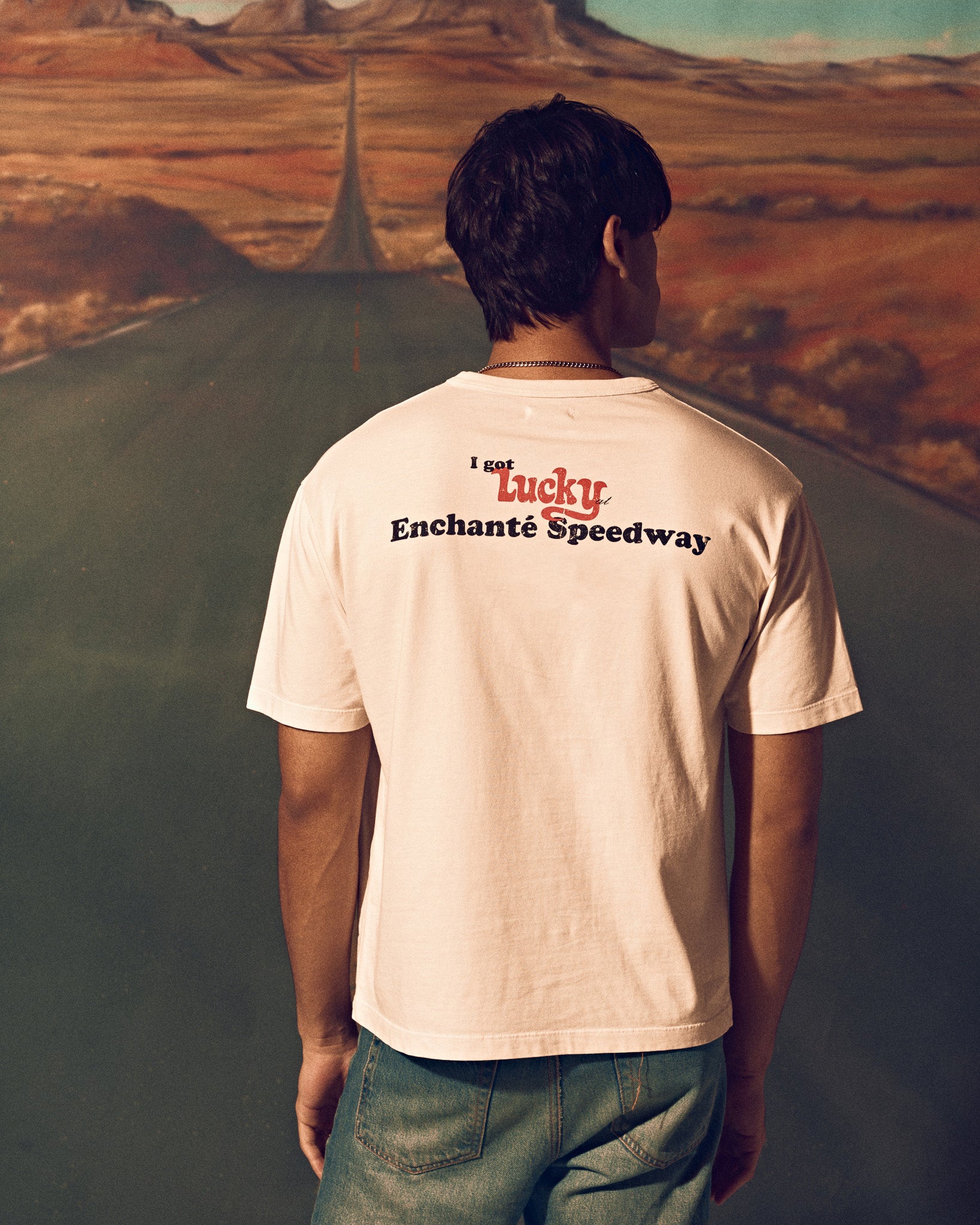 The Lucky Three Tee leans into retro Speedway energy with distressed front and back graphics straight out of a Las Vegas night. Garment-dyed for a soft, lived-in finish, each piece carries its own unique character.