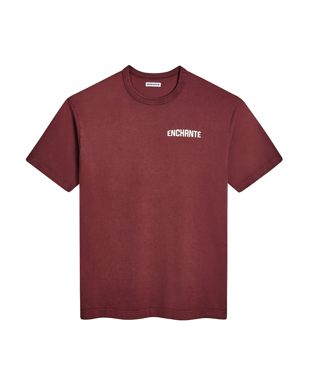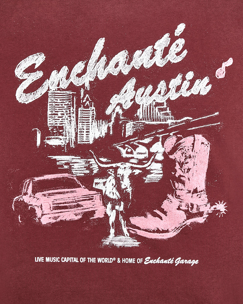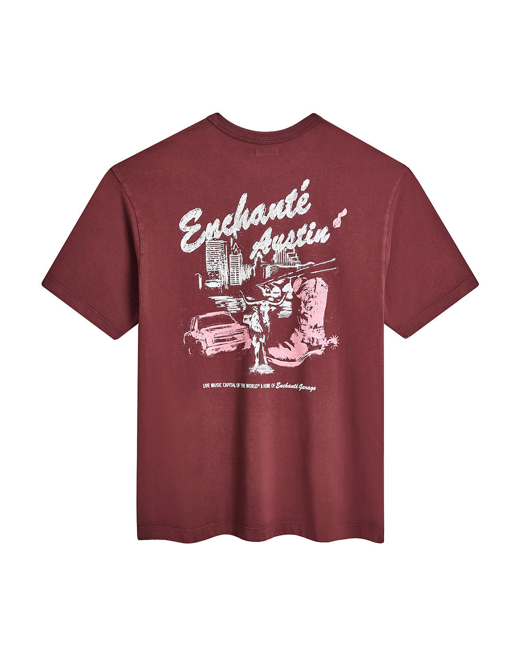 Inspired by the energy and charm of ATX, the Enchanté, Austin Tee features a vintage-style back print showcasing the city’s skyline, a pickup, and a cowboy boot. Finished in washed maroon with a subtle Enchanté logo on the front, it captures the easy, creative spirit of Austin.