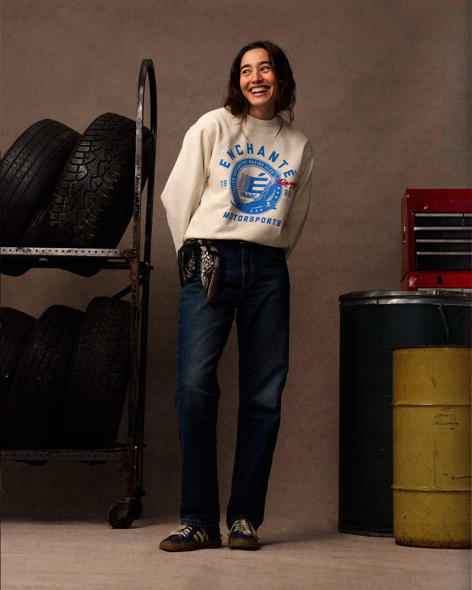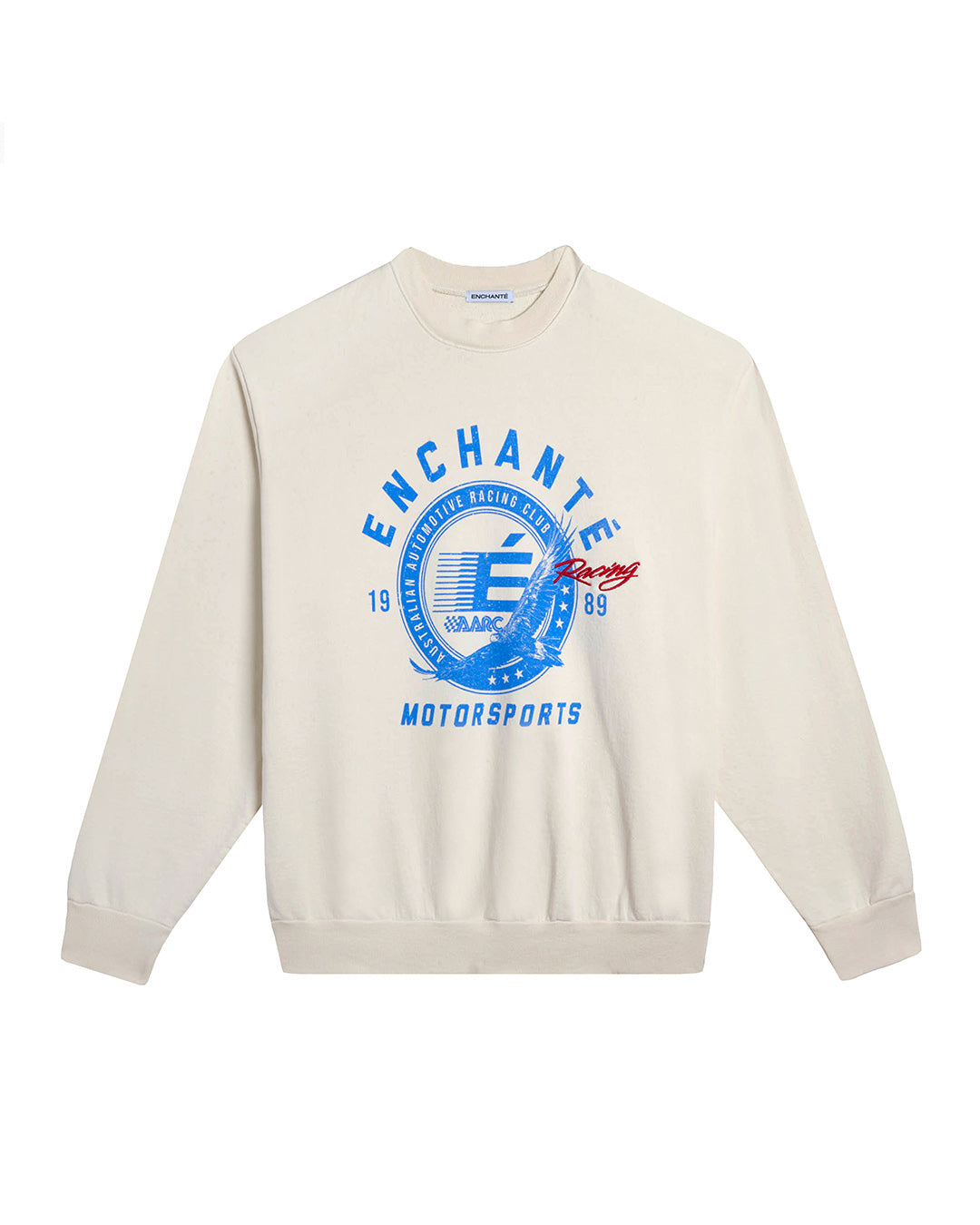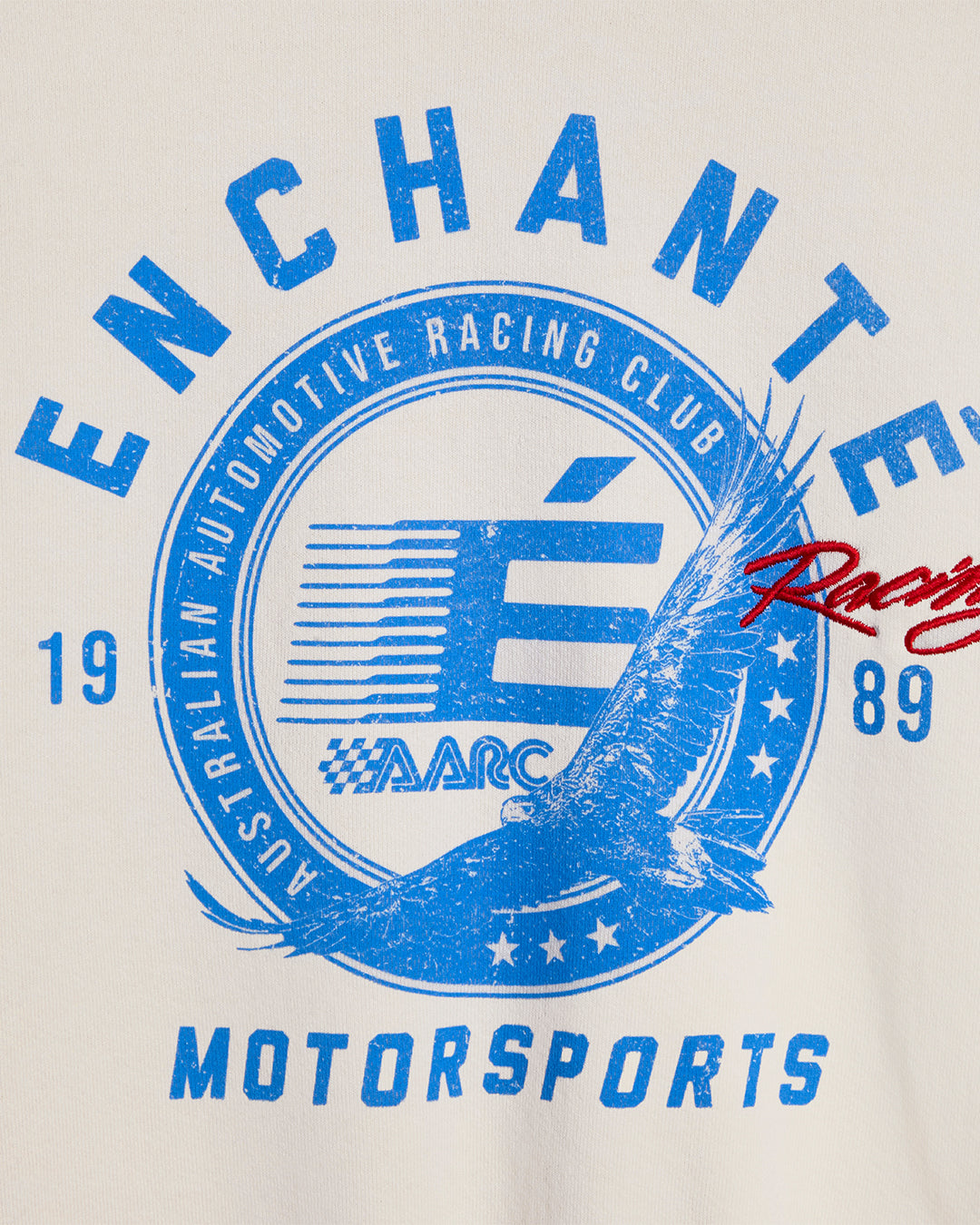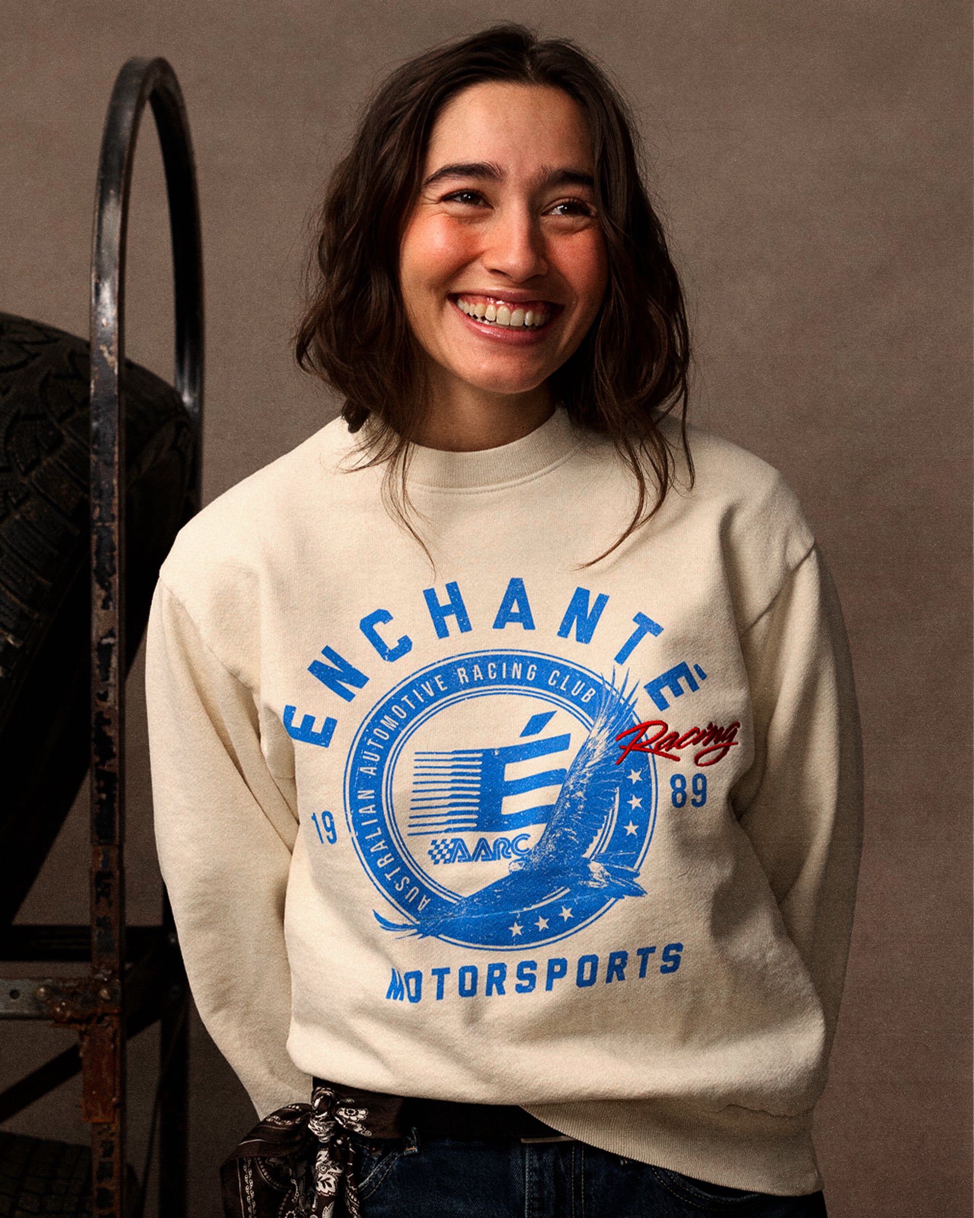 A bold motorsport graphic brings vintage paddock energy to this crewneck. Made in the USA from 100% cotton with screen print and embroidered detailing.