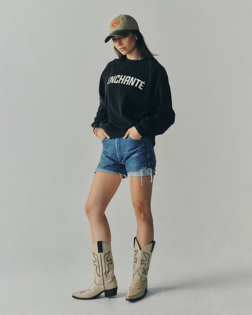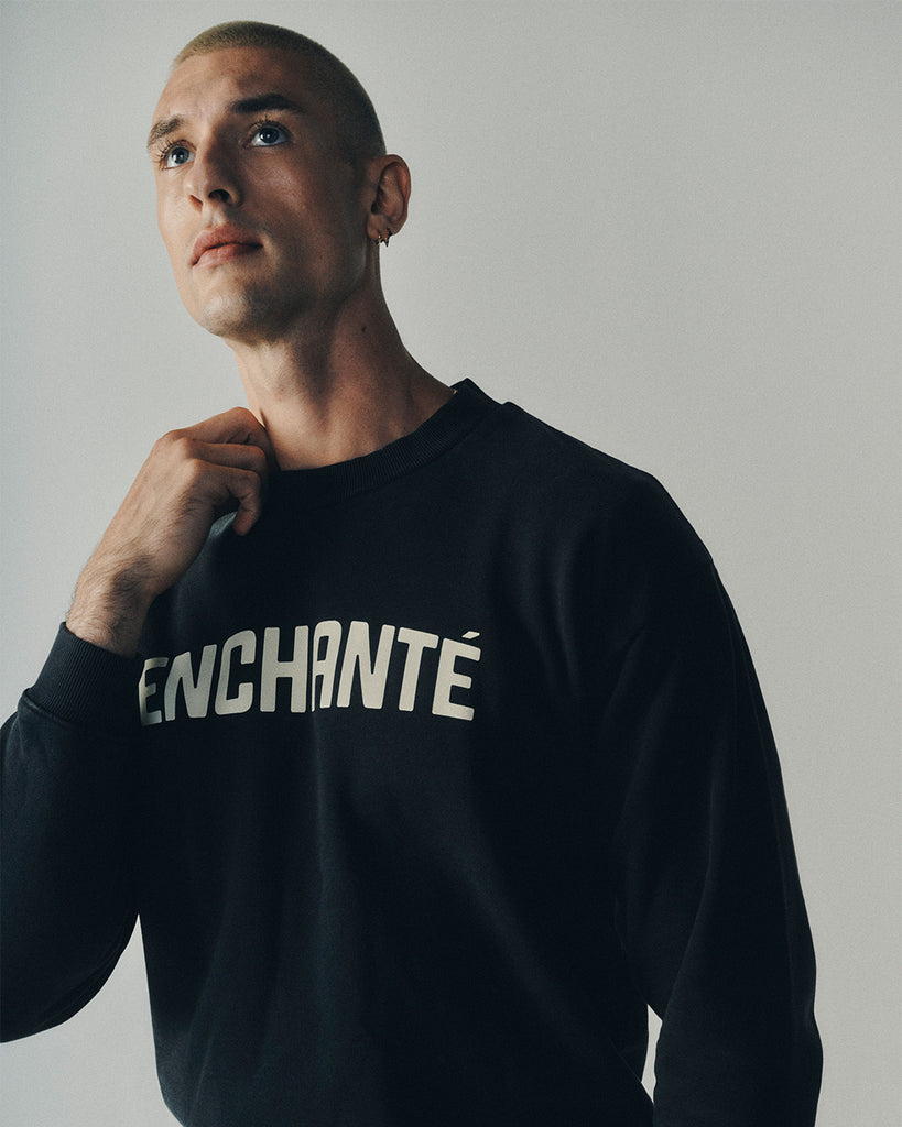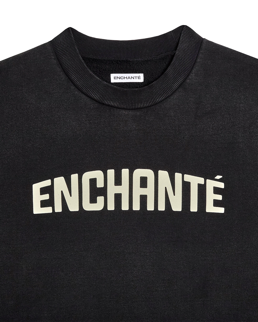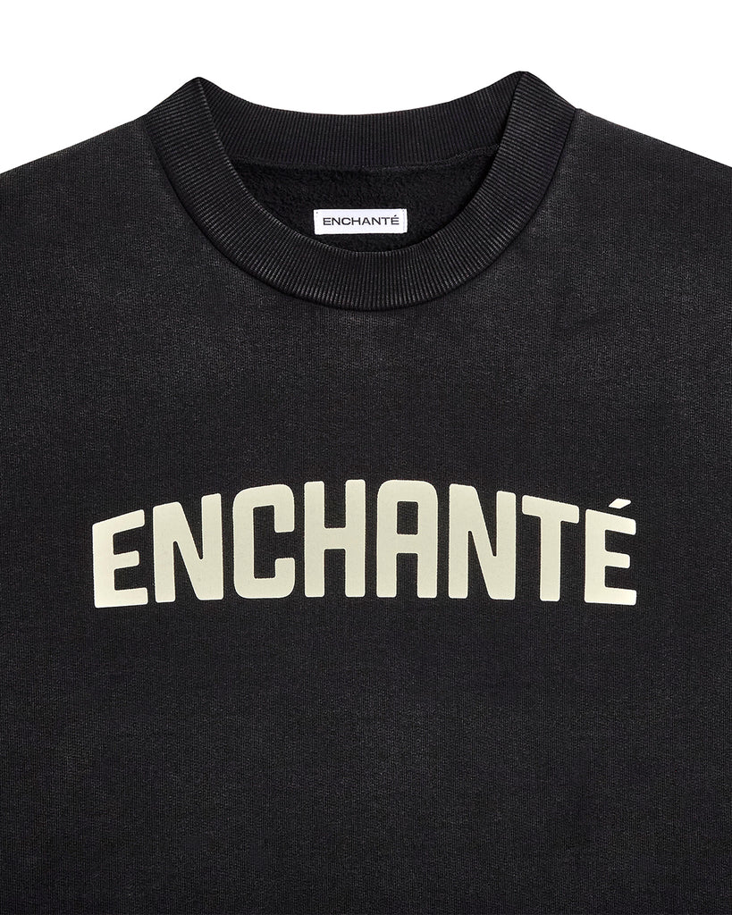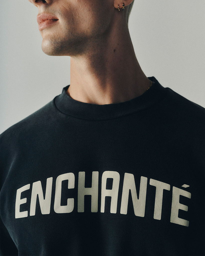 Utility on the outside, comfort underneath. This heavyweight crewneck features a bold, arched Enchanté print across the chest, inspired by vintage workwear and old-school auto uniforms. Garment-dyed for a lived-in finish, it’s a staple built to last.